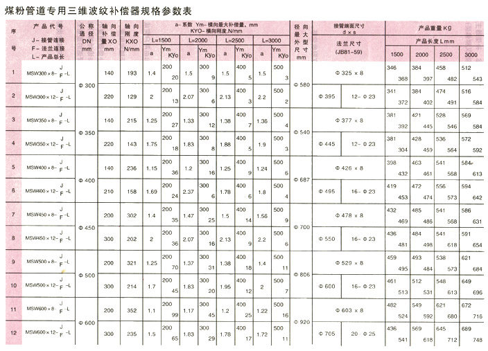 煤粉管道專(zhuān)用三維波紋補(bǔ)償器規(guī)格參數(shù)表